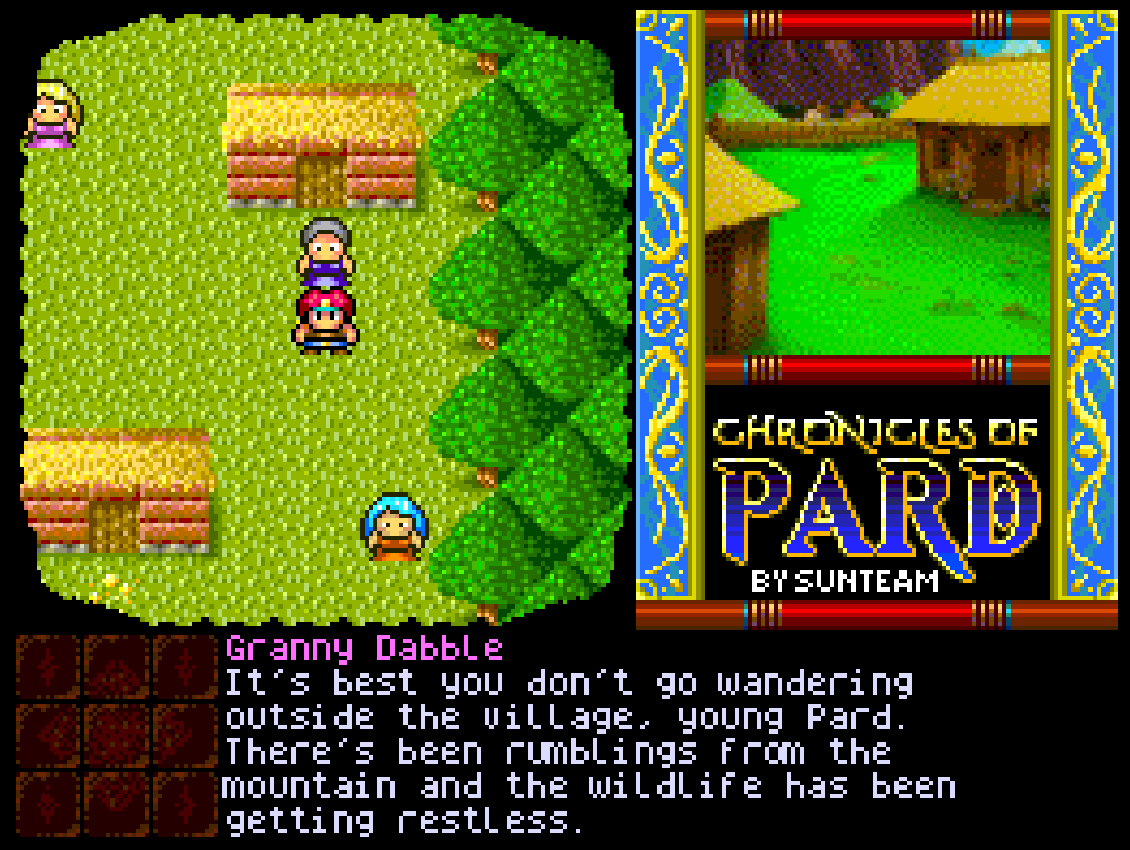 There is a template game included, along with a fuller sample game 'The Chronicles of Pard', to give you an idea of what can be done. An early version of the system was also used in the game 'Santa's Magic Cookies' available on issue 3 of Nexter (Nexter (ZX Spectrum Next) by sunteam).